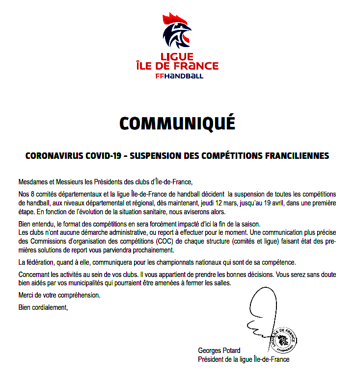 URGENT - Communiqué officiel du LIMAY HANDBALL CLUB 78 - Je sais pouvoir compter sur votre compréhension et responsabilité face à cette situation inédite qui touche la santé de tous les citoyens. |